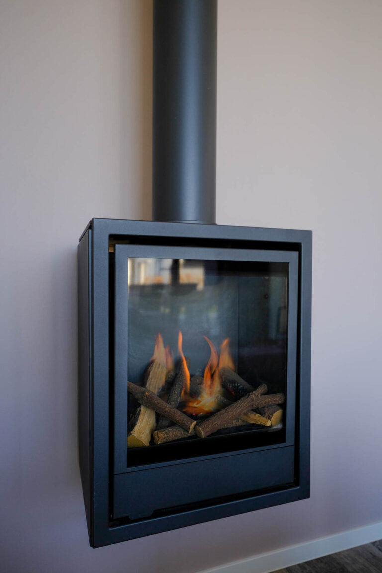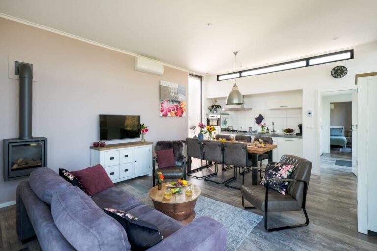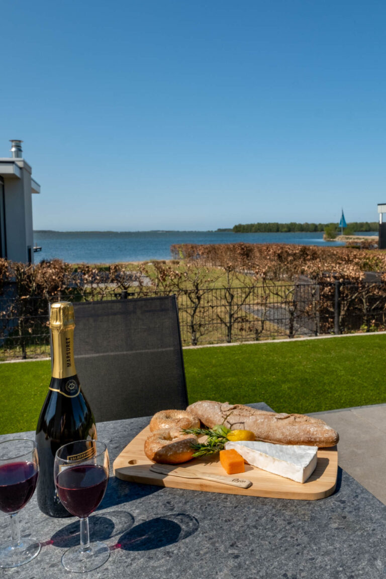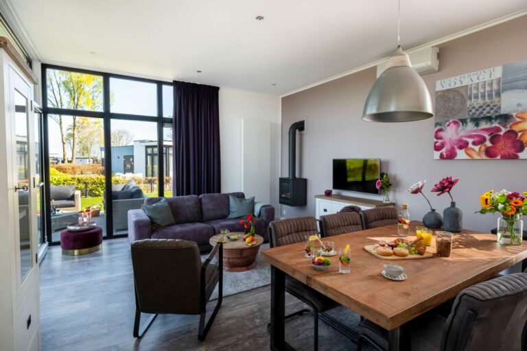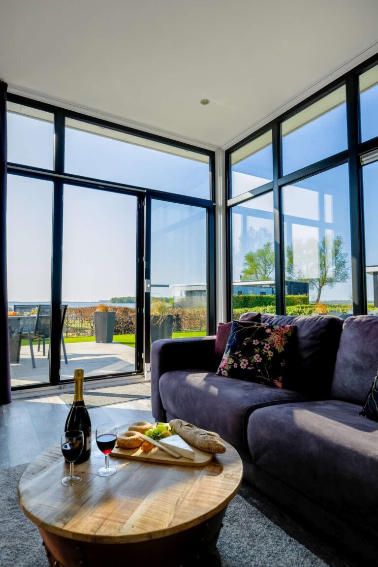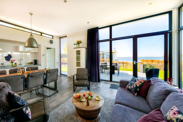 Das Wohnzimmer verfügt über eine modern gemütliche Couch mit zwei Sessel, sowie einen Flachbild-Fernseher. Zur Wandseite finden Sie einen luxuriösen Kamin und zur Fensterseite den herrlichen Ausblick auf das Veluwemeer. Der offene Wohnraum verfügt über eine Klimaanlage.