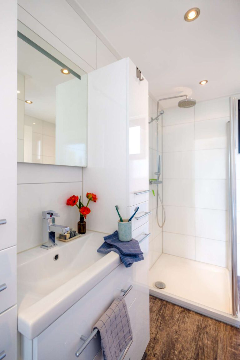 Das angrenzende Badezimmer ist auch direkt über das Hauptschlafzimmer zu erreichen.Das Badezimmer ist mit einer großzügigen Regendusche, sowie einem Waschbecken mit drei Schränken, einem LED-Spiegel und ein WC ausgestattet und verfügt über ein Fenster.