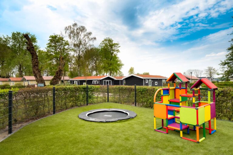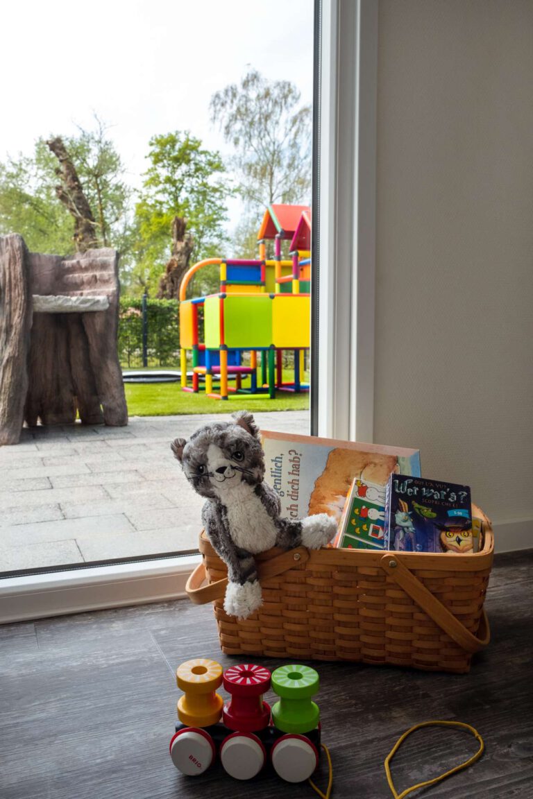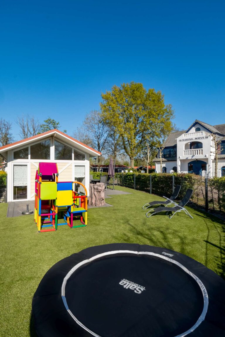 Der Garten ist mit einer geräumigen Terrasse versehen. Ein Tisch mit 4 Stühlen und Design-Grill, sowie die Sonnenliegen laden zum Verweilen ein. Der Garten ist komplett eingezäunt und eignet sich daher gut für Familien mit kleinen Kindern und Hunden. Für die Kinder wurde im Garten ein Trampolin und ein Spielturm verbaut.