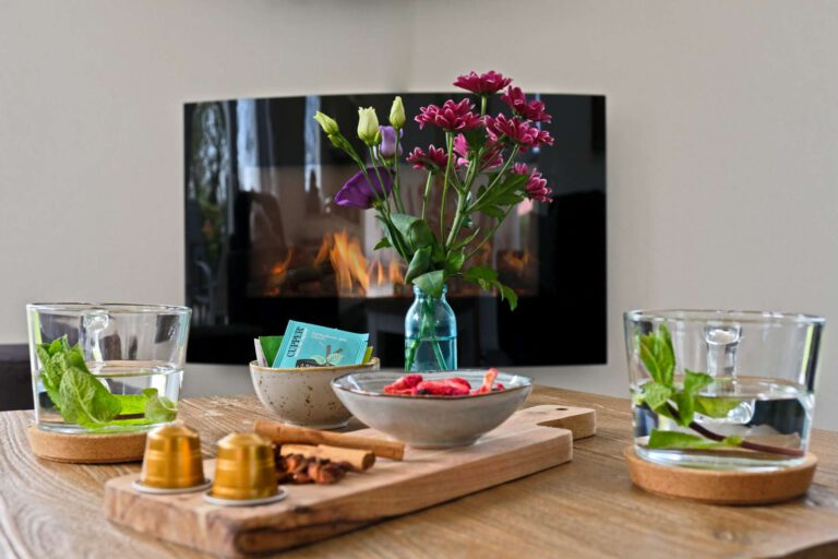 Das helle Wohnzimmer ist mit einem luxuriösen Deko-Kamin, gemütlichem Sofa mit zwei Sessel, Couchtisch und einem Fernseher ausgestattet.