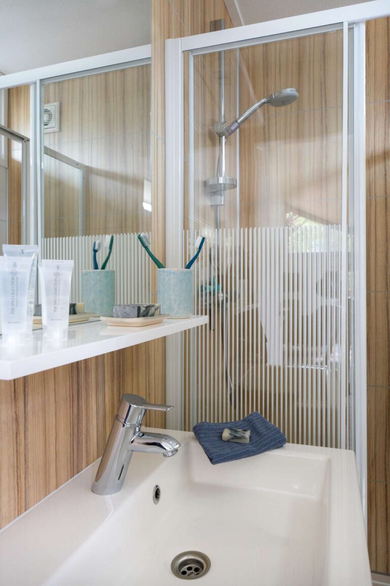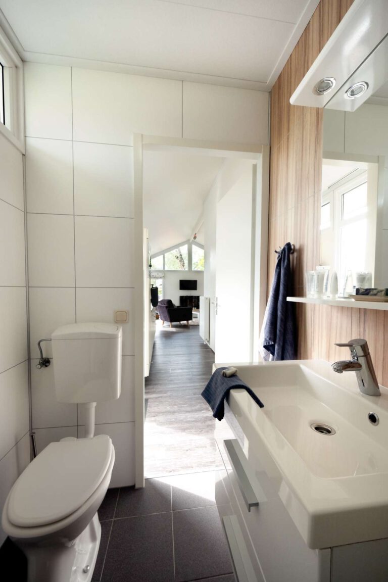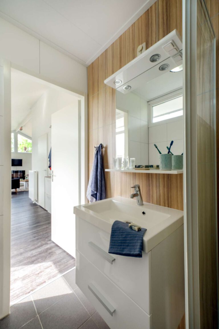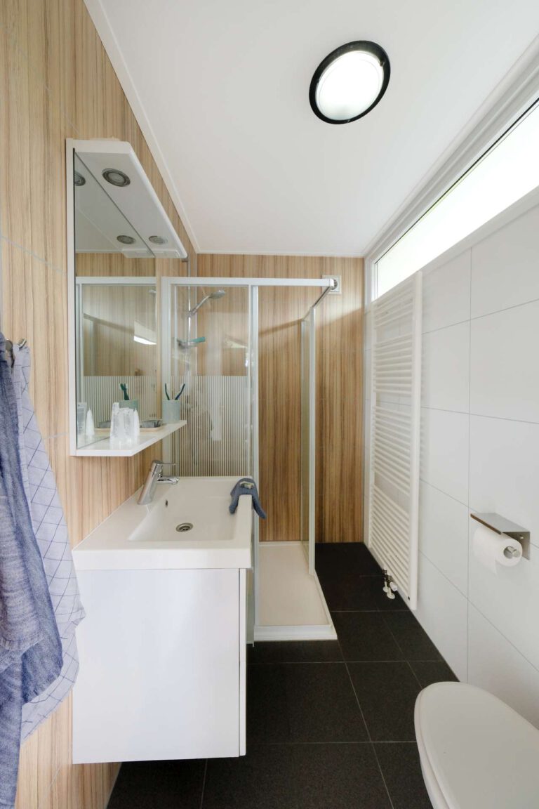 Das Badezimmer ist mit einer großzügigen Dusche, sowie einem Waschbecken mit Unterschrank, einem LED-Spiegel und ein WC versehen.