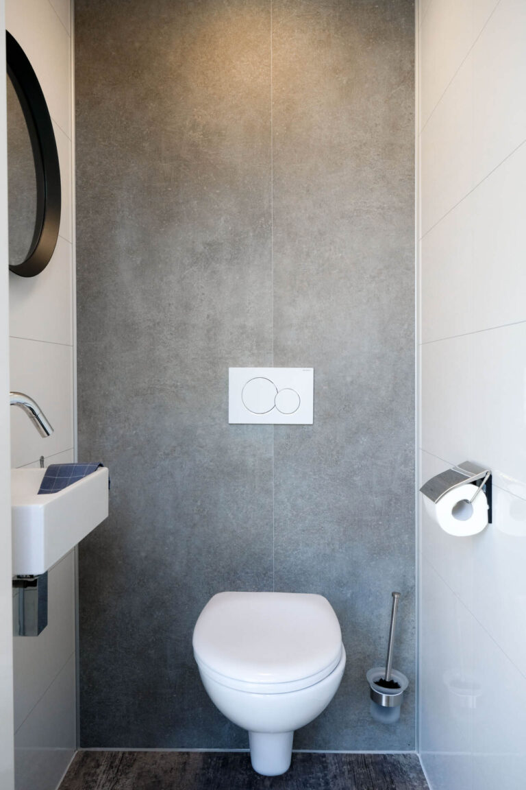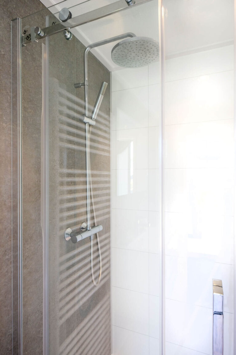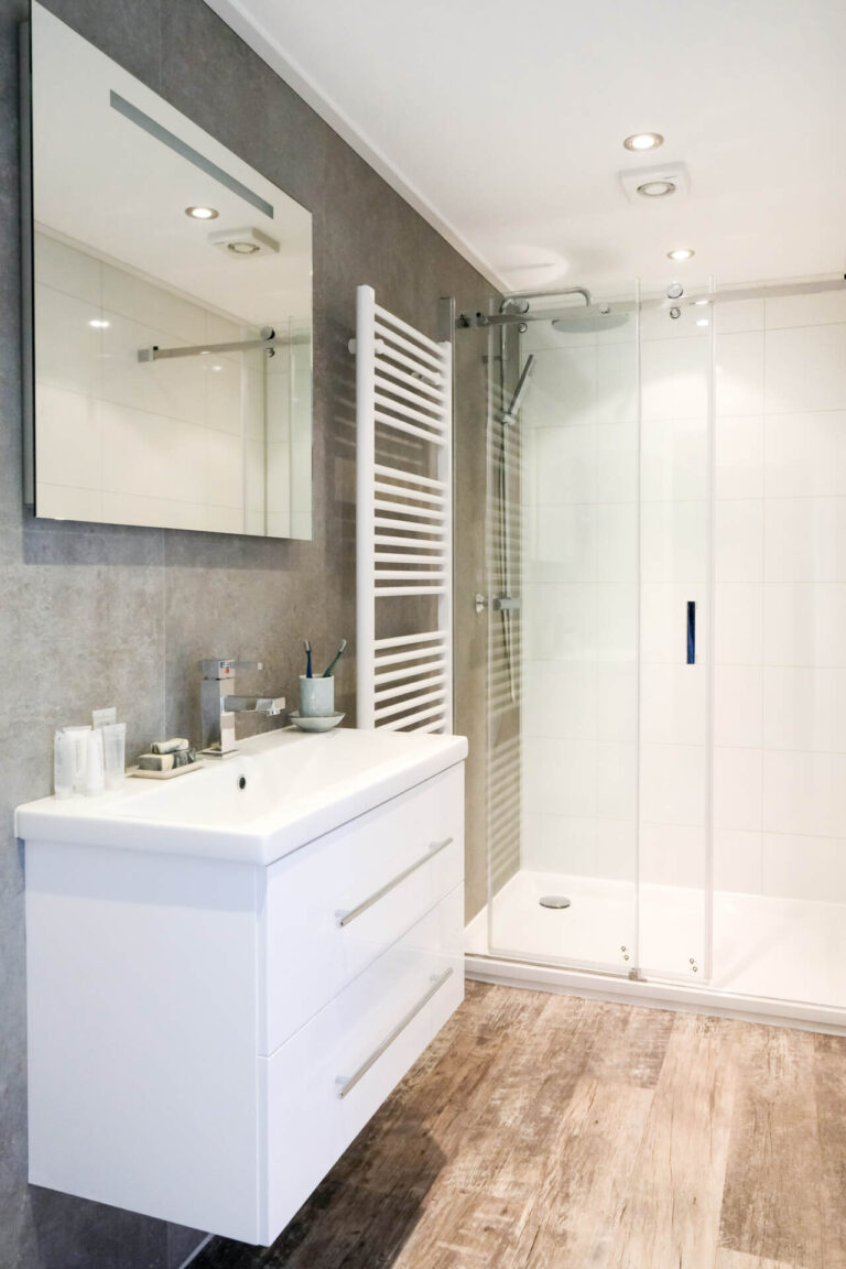 Das große Badezimmer ist mit einer großzügigen Regendusche sowie einem Waschbecken mit Unterschrank und einem LED-Spiegel ausgestattet. Das WC ist separat.